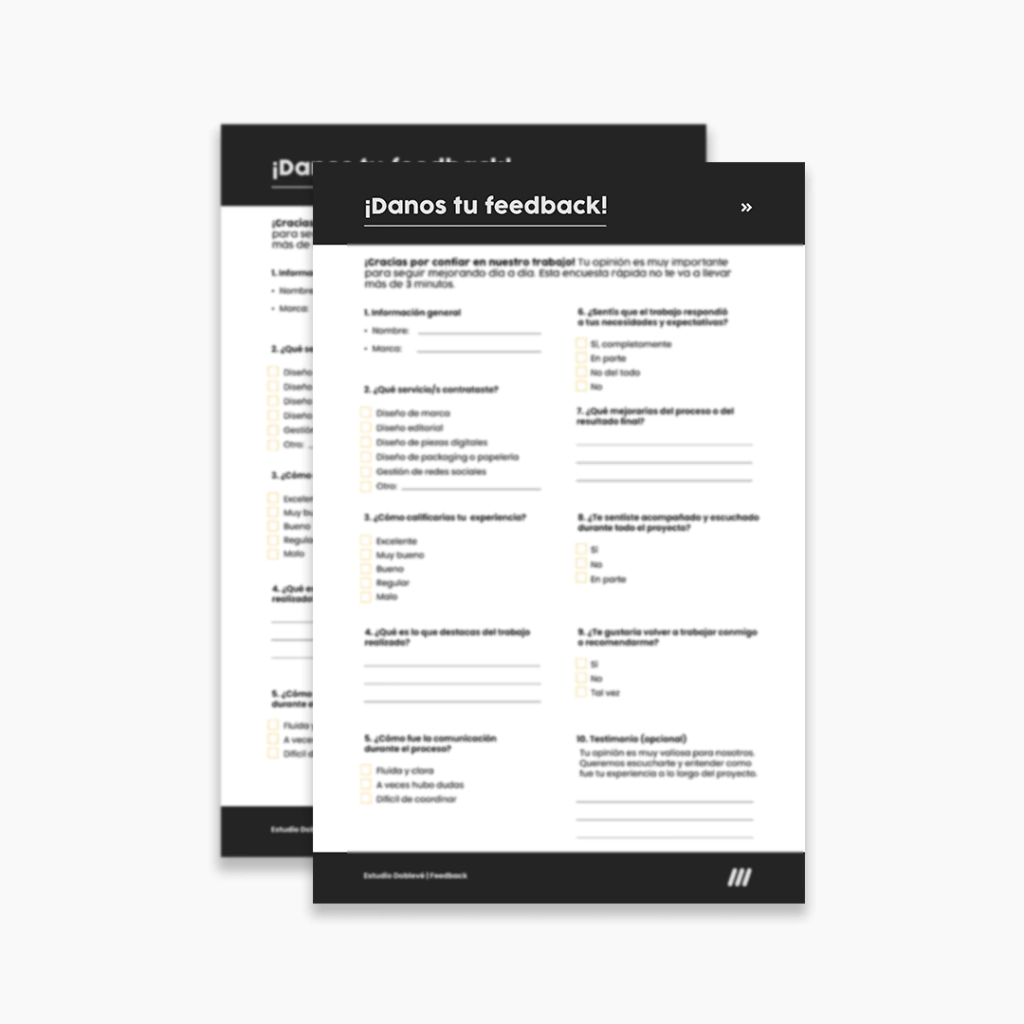 Es un cuestionario listo para usar, diseñado para enviar a tus clientes una vez terminado un proyecto. La idea es que puedan compartir su experiencia de manera rápida, clara y sincera. En solo 3 minutos, vas a obtener información valiosa sobre lo que funcionó, lo que se puede mejorar, y cómo se sintieron durante el proceso.